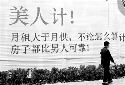 “寧可相信世上有鬼,也不能相信男人那張嘴!边@句眾女傳閱調(diào)侃男性的話語(yǔ),近日卻被變相地搬上臺(tái)面,成為商家?jiàn)Z人眼球的廣告語(yǔ)。“月租大于月供,不論怎么算計(jì),房子都比男人可靠!”近日,棉紡東路某房產(chǎn)商的一條廣告引發(fā)了一場(chǎng)關(guān)于廣告與男性尊嚴(yán)的爭(zhēng)論。