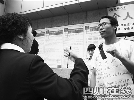 “求職意向不限,只要不違背道德和法律;出讓5年青春,每年年薪10萬!毕胍舐殻瑓s又不帶任何相關(guān)證件,只靠胸前掛著的“賣身求職”的告示,出現(xiàn)在招聘會門外,尋求用人單位和他聯(lián)系。昨日,寧夏街中國成都人才市場正舉辦一場人才招聘會,而招聘會大門外,一名胸前掛著“賣身求職”告示的年輕人,卻引來周圍群眾紛紛駐足。對于年輕人這種行為,用人單位看法不一。