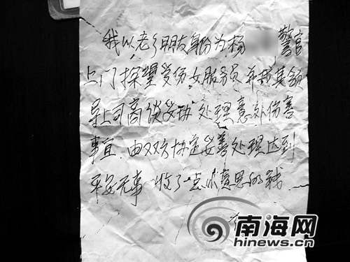 楊警官要求蔡某寫(xiě)下一張收條,蔡某當(dāng)場(chǎng)寫(xiě)道:我以老鄉(xiāng)朋友身份為楊警官上門(mén)探望受傷女服務(wù)員,并找其領(lǐng)導(dǎo)上司商談妥協(xié)處理意外傷害事宜,由雙方協(xié)定妥善處理達(dá)到平安無(wú)事,收了一點(diǎn)小意思的錢(qián)。