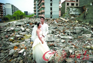 2009年4月21日下午,在(四川綿竹縣)漢旺鎮(zhèn)舊城東汽中學的殘垣斷壁上出現(xiàn)美麗感人的一幕:曾救出“可樂男孩”薛梟的志愿英雄陳巖與穿著潔白婚紗的妻子彭露在這里拍下婚紗照,以紀念他們動人愛情的永恒紀念。