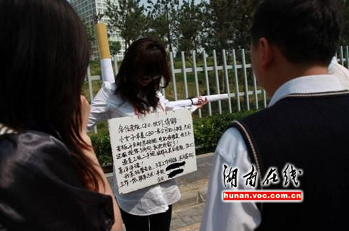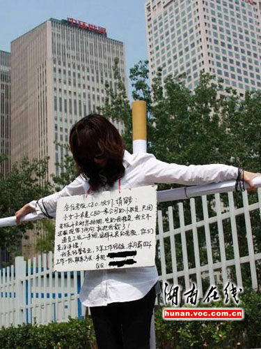 “為了找工作,真是無(wú)所不用!”日前,網(wǎng)友在華聲論壇發(fā)帖,稱在當(dāng)?shù)氐囊粐?guó)貿(mào)大廈CBD辦事時(shí),看見(jiàn)一年輕女子背著一個(gè)巨型十字架,雙手展開(kāi)綁在十字架上,而她這樣做只為“求得一份工作”。