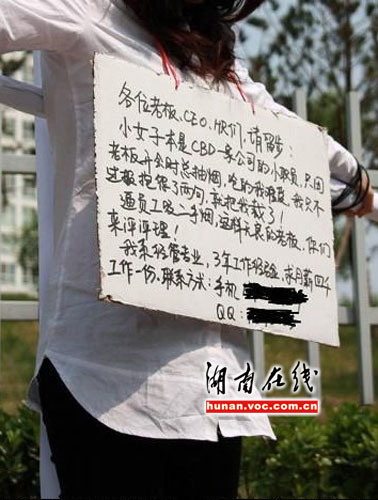 圖中女子身著修身白襯衣和黑色長(zhǎng)褲,大幅框架眼鏡以及垂下的頭發(fā)遮住了臉,讓人看不清容貌。身上所背的十字架高出其頭頂,上面還有個(gè)過(guò)濾嘴,狀如香煙。據(jù)其胸前牌子上的文字描述,該女子是一“失業(yè)白領(lǐng)”,原老板喜歡在會(huì)議室吸煙,自己因受不了二手煙的危害,發(fā)了幾句牢騷,結(jié)果被老板辭退,所以采用行為藝術(shù)方式來(lái)求職。