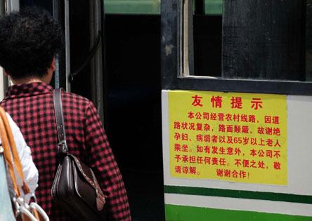 在新店至北峰客運專線班車上,記者看到,車門上或者車內(nèi)并未張貼類似的提示或免責(zé)條款,沿途也不時有老人乘車。
