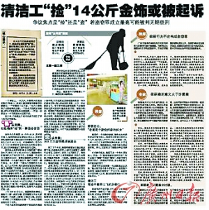 連日來,本報(bào)(廣州日?qǐng)?bào))率先報(bào)道的《清潔工“撿”14公斤金飾或被起訴》在社會(huì)上引起了極大爭論,尤其在法律界產(chǎn)生震動(dòng),中國律師網(wǎng)在網(wǎng)頁頭條討論該案,國內(nèi)很多著名律師對(duì)該案發(fā)表了評(píng)論。