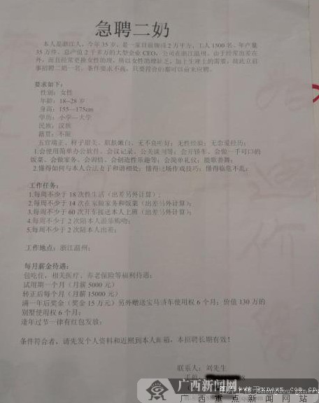 記者在網(wǎng)上找到了這張啟事的圖片,上面介紹說(shuō),招聘二奶的主角是浙江溫州一家服裝公司的CEO,姓劉,招聘的目的是為了滿足“工作出差、生活上的需要。”