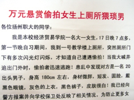 18日,一張張名為《萬元懸賞偷拍女生上廁所的猥瑣男》的“懸賞啟事”,張貼在了揚(yáng)州職業(yè)大學(xué)校園內(nèi),吸引了該校師生的注意。記者看到,“懸賞啟事”標(biāo)題的字體和顏色都格外醒目,內(nèi)容為一位大一女生遭遇偷拍的經(jīng)歷!拔沂潜拘=(jīng)濟(jì)貿(mào)易學(xué)院一名大一女生,17日晚7點(diǎn)多,第一節(jié)晚自習(xí)期間,我到一號(hào)教學(xué)樓上廁所,突然廁所門下有多次閃光燈閃爍,才知道自己遭遇偷拍!……我已經(jīng)向警方報(bào)案并向?qū)W校保衛(wèi)處反映了相關(guān)情況。為防止更多女生受侵害,早日將這種性變態(tài)的人繩之以法,我個(gè)人出10000元懸賞知情人提供有價(jià)值線索!庇浾咦⒁獾,“10000元”的字體很大,而且是紅顏色,格外惹眼。啟事最后還寫著“捍衛(wèi)女生權(quán)益,和偷拍斗爭(zhēng)到底”的字樣。