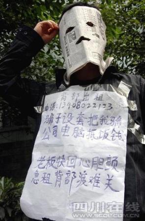 一男子昨日在成都街頭以100元每天的價(jià)格出租背部,號稱“資深策劃人”的王江同時(shí)出現(xiàn),但他否認(rèn)是其杰作