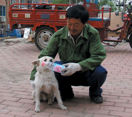 這只流浪的小狗叫小丑兒,原來的主人住在星海街,因為搬家而將它遺棄了。今年4月大,連降了一場很大的雨雪,因天氣的原因,收廢品的王先生沒有出門,在家中把幾天收的廢品整理一下。在搬廢品的時候,王先生突然聽到類似呻吟的聲音,于是就順著聲音找去,看到了一只白色的小狗蜷縮在廢品邊上,瑟瑟發(fā)抖,無精打采的,眼睛里流露出求助的神情。王先生把它抱進屋,并給它吃的喝的。當天氣暖和時,王先生便把小狗送到了門外,準備放走,可這只小狗怎么也不肯離開王先生。從此,王先生出去收廢品的時候,走到哪里,小丑兒便跟到哪里,還把街上被人遺棄的瓶子,撿到王先生的跟前。后來,王先生從鄰居們那得知小丑兒的經(jīng)歷,便把它留在了自己身邊。