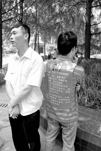 雖然是公開征婚,但王先生和曾天華都顯得很靦腆,不怎么說話。倒是跟在他們身后,戴著墨鏡、背著大牌子的紅衣男子更受人關(guān)注。他就是幾天前在街頭出租背部的黃某。曾天華出了100元錢租用他的背部一天,讓其背著廣告牌子,為征婚造勢。