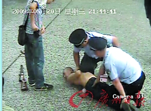 晚上9時(shí)44分41秒,兩人合力將男子摔倒在地,小鄧立即拿出手銬控制住男子。
