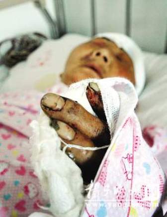 在南京軍區(qū)總醫(yī)院的一張病床上,記者見到正在輸液的李步琴老人,她頭部、手部纏著厚厚紗布。記者了解到,不連頭上的傷,老人手指、鎖骨、肋骨五處骨折,還餓了4天,老人現(xiàn)在已經(jīng)恢復(fù)了神志,思維敏捷,不能不說是個奇跡。老人告訴記者,5月19日傍晚她和工程隊開挖土機的吵了一架,因為他們挖壞了自己的菜地。當(dāng)天晚上8點多鐘,突然有個人沖進她居住的泵房,進門就跟她要錢。剛開始她以為遭遇劫匪,無奈之下,只好從口袋里掏出一張皺巴巴的百元鈔票,可對方拿到錢后,仍不罷休,竟然揚言要火燒房子。還不問青紅皂白,甩起一根棍子就朝她頭上夯,她雙手抱住頭,棍棒繼續(xù)擊打在她的頭上、身上,直到她昏死過去。老人居住的地方?jīng)]有水電,因此當(dāng)時光線黑暗,她沒有看清楚對方什么樣子,但是她記得對方毆打她的時候曾經(jīng)問過她:“以后還給不給開路?”這個“開路”是什么意思?老人解釋說,她的菜地占了挖掘機的路,她曾經(jīng)與對方交涉過多次。