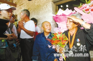 "回家了,我終于在自己的有生之年回家了……"昨日下午,當(dāng)胸掛抗日紀念獎?wù)碌?8歲川籍遠征軍老兵劉召回,下車后邁出右腳,踏上四川省岳池縣裕民鎮(zhèn)的故土?xí)r,禁不住老淚縱橫——這一刻,他已等了整整67年!
