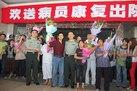 下午三點半,9名已康復(fù)的傷員在醫(yī)務(wù)工作者和家屬的陪同下走出了外科樓。四川省衛(wèi)生廳副廳長趙萬華與該醫(yī)院部分領(lǐng)導向傷員們贈送了鮮花,并握手、拍照留念。