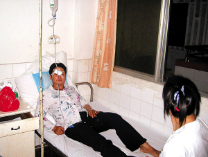 晚上8時(shí)許,記者走進(jìn)了中醫(yī)院的外科病房,除110室的一位女傷者仍在昏迷中外,其余4人均在二樓外科病房接受觀察治療。41歲的李雪×右眼逢了5針,她來自超竹鎮(zhèn),以踩三輪車載客為生。談起突如其來的一幕,她說一時(shí)間覺得好像一部推土機(jī)向她推來,以后就失去了知覺。