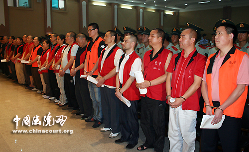 早晨8點(diǎn)左右,唐亞南等23名原審被告人由警車押送到庭,八點(diǎn)半左右,開始開庭審理。審判長宣布開庭后,唐亞南等23名原審被告人被帶入庭審現(xiàn)場,站到法庭的被告席上。法官當(dāng)庭宣讀了一審判決書,一審判決以集資詐騙罪判處原審被告人唐亞南死刑,剝奪政治權(quán)利終身,并處沒收個人全部財產(chǎn);以集資詐騙罪判處原審被告人丁魁元死刑,緩期二年執(zhí)行,剝奪政治權(quán)利終身,并處沒收個人全部財產(chǎn);以集資詐騙罪判處原審被告人李全才、鄧書杰、彭標(biāo)、李凱無期徒刑,剝奪政治權(quán)利終身,并處沒收個人全部財產(chǎn)。其他15名原審被告人分別以隱瞞犯罪所得罪、非法吸收公眾存款罪、集資詐騙罪被判處三年至十五年不等的有期徒刑;另兩名原審被告人被判非法吸收公眾存款罪,因情節(jié)輕微,免予刑事處罰。一審宣判后,唐亞南等19名原審被告人提出上訴。