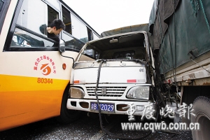 昨下午1點(diǎn)半,記者在事發(fā)地雙碑石井坡車(chē)站紅綠燈處看到,一輛長(zhǎng)安小貨車(chē)卡在805路公交車(chē)和另一輛貨車(chē)之間。長(zhǎng)安小貨車(chē)車(chē)體嚴(yán)重變形,擋風(fēng)玻璃全部被撞爛,碎玻璃撒了一地。公交車(chē)和另一輛貨車(chē),車(chē)身上都有重重的擦損痕跡。