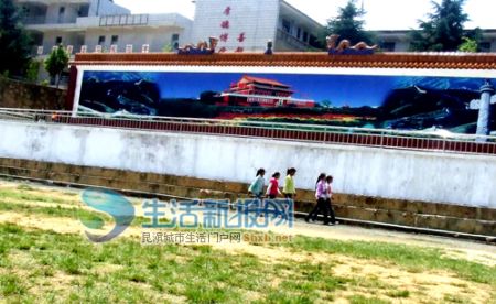 6月16日14時(shí)許,記者來到離曲靖市區(qū)約10公里的寥廓街道中學(xué)。足球場(chǎng)旁,一堵長(zhǎng)約400多米,高約2米的圍墻異常醒目,面對(duì)教學(xué)樓的那一段圍墻,卻突然高出了一截。墻頭鑲嵌有黃色琉璃瓦,上面屹立著有藍(lán)黃琉璃瓦做成的兩龍戲珠,而墻壁中間則是一幅北京天安門城樓油畫。