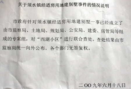 在落款時(shí)間為2009年6月18日的“關(guān)于須水鎮(zhèn)經(jīng)適房用地建別墅事件的情況說(shuō)明”中顯示:“市政府針對(duì)須水鎮(zhèn)經(jīng)適房用地建別墅一事已經(jīng)成立了由市監(jiān)察局、土地局、規(guī)劃局、公安局、建委、房管局等組成的專案組,對(duì)“西湖小區(qū)”進(jìn)行聯(lián)合查處。查處結(jié)果由市監(jiān)察局統(tǒng)一向外公布,各個(gè)部門無(wú)答復(fù)權(quán)!