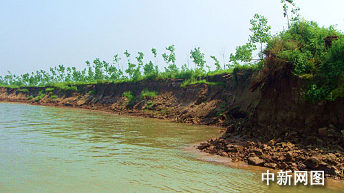 記者現(xiàn)場(chǎng)看到,50多條船滿載石頭,在江中心拋石作業(yè)。江兩岸被江水沖刷,有的地方發(fā)生崩岸,整棵樹(shù)倒伏在江岸。