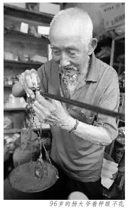 “大爺,幫我稱點白糖……”一名顧客喊道。只見老人從一大袋白糖中用勺子舀了一小袋,放在柜臺上的秤盤上,輕推秤砣。“一斤二兩!”老人喊道,“二元五一斤,一斤二兩三元!”這,恐怕只是96歲的楊大爺日常生活中的一個普通瞬間吧,記者尋思!按鬆,幫我拿包藍(lán)嬌嘛……”為了進(jìn)一步驗證人們的說法,記者說道!12元!”楊大爺從十幾個品牌的香煙中,準(zhǔn)確地拿了一包藍(lán)嬌放在柜臺上!罢夷88元!”見記者拿了一張百元紙幣,楊大爺隨即回話。楊大爺把百元大鈔放到陽光下,細(xì)細(xì)查看水印,并不斷用手摸著紙幣的防偽標(biāo)志。確認(rèn)為真幣后,楊大爺迅速地給記者找了零錢。