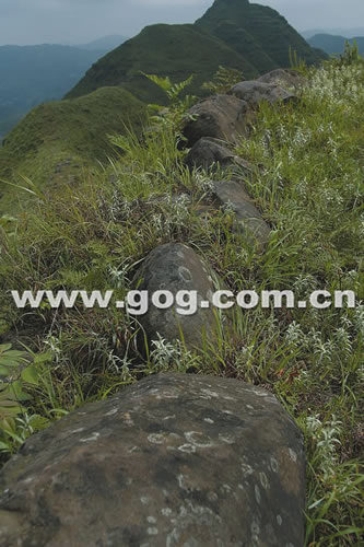 登上山頂后,楊海發(fā)現(xiàn),蜂糖梁子的主峰頂是一片植被覆蓋的平地。在峰頂以下近兩米處的草叢中,他發(fā)現(xiàn)了一排經(jīng)過人工開鑿并打磨過的方形巨石,它們依次面向南面排列著,這些巨石色澤不同于呈青灰色天然巖石,全部呈褐紅色,且每一塊巨石的重量大約都在數(shù)噸以上。在主峰與東邊第一座山峰相連接處的草叢中,還有兩段保存較為完整的石墻,石墻沿著山崖呈弧形分兩層躍式向主峰包圍,每一層所圈面積大約都在十幾個平方米以上。