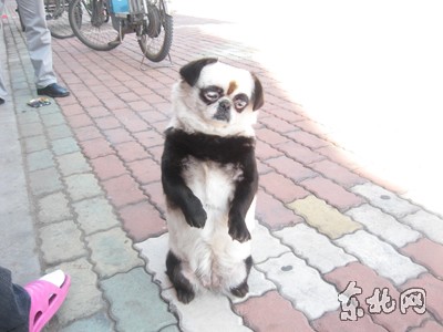 兩只拳頭大小的黑眼圈,短小的黑耳朵,圓圓的臉,肥身體,四肢及胸部為黑顏色,其余毛色均為白色。從遠(yuǎn)處慢騰騰的走過來,人們都以為這是一只憨態(tài)可掬的小熊貓?墒聦嵤牵@是一只被主人染成熊貓模樣的小狗。