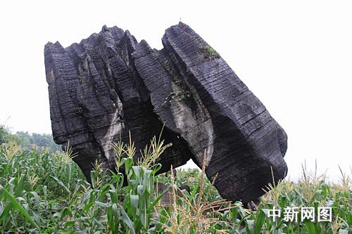 記者在長(zhǎng)寧縣梅硐鎮(zhèn)中坪村看到,這兩塊“奇石”緊緊依偎連在一起,巋然不動(dòng)地聳立在一塊玉米地中間的石灰石上,成60多度角向南傾斜;每塊“奇石”高10米左右,周長(zhǎng)在12米以上;“奇石”底部與地面出露的石灰石基巖并未“生”在一起,而是像放在上面一樣。南(左)面的那塊石頭要“矮胖”些,與地面有兩個(gè)接觸點(diǎn);北(右)面的則“苗條”些,與地面只有一個(gè)接觸點(diǎn)。