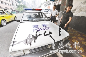 記者在現(xiàn)場(chǎng)發(fā)現(xiàn),除渝A24796、渝A25718兩輛旅游大客車,停靠在長航公安局朝天門派出所門前的兩輛桑塔納警車同樣遭殃,擋風(fēng)玻璃和引擎蓋上分別被人潑灑了一層油墨,地上還留下了油墨痕跡,呈點(diǎn)射狀。由于兩警車是出警車輛,派出所只好開進(jìn)修理廠用專用清洗液清洗油墨。