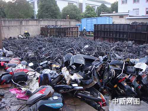 中新網(wǎng)寧波7月8日電(何蔣勇 歐陽峰)7日下午5時50分許,位于浙江省寧海縣興寧中路45號的寧?h物資再生利用有限公司發(fā)生一起火災(zāi),濃煙沖天達(dá)百余米高,整個寧?h城都能清楚地看到黑煙滾滾。當(dāng)?shù)叵啦块T先后出動四輛消防車、近四十余名官兵參與火災(zāi)撲救,約40分鐘后成功將大火撲滅,但是該公司露天堆場內(nèi)近百輛廢舊摩托車被大火燒成骨架。