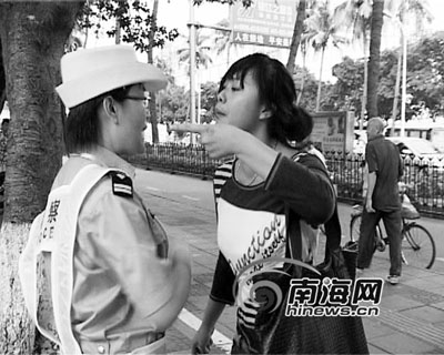 當天下午4點45分,22歲女大學生小蕊走出銀龍影城橫穿6個車道后,在首力大廈被現(xiàn)場執(zhí)勤的?诮痪瘮r下。當交警告知她,翻越護欄橫穿馬路屬于交通違法行為需接受處罰時,小蕊聲稱自己是第一次,身上也沒帶錢,隨后便開始“發(fā)飆”了。“你她媽的xx,我x你媽!边@名女大學生開始對交警進行辱罵。?谑薪痪ш犚幻撠煍z像的工作人員對這一過程進行錄像時,女子一把抓過攝像機準備砸在地上時,被交警及時制止,“你要是砸了錯就更大了”。