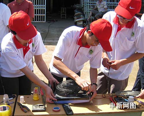 7月9日,我們無線電協(xié)會的成員又在這里當(dāng)起了義務(wù)維修工。起初,只是有不少群眾圍觀,并沒有人拿來舊電器要修理。他們有些遲疑:這群孩子,能修好嗎?過了好大一會兒,一位大嬸拿來了一個電飯鍋,我們趕緊接了過來。由于沒有專業(yè)人員修理,電飯鍋已經(jīng)好久不能用了。最終,我們憑借過硬的技術(shù)贏得了大嬸的贊揚,同時也讓圍觀的人少了份猶豫,多了份信任。大家開始爭先恐后地拿來自己家里有問題的電視機(jī)、電風(fēng)扇要我們幫忙修理!雖然烈日當(dāng)空,我們卻忙得不亦樂乎,連汗都顧不上擦!“看到鄉(xiāng)親們拿著修好的電器喜笑顏開的樣子,我打心眼里高興!希望以后能為更多的鄉(xiāng)親服務(wù)!”一位隊員高興地表示。在一天的義務(wù)維修中,隊員們充分調(diào)動了自己的專業(yè)知識,積極聯(lián)系實際,提高自己動手能力的同時又服務(wù)了鄉(xiāng)親。