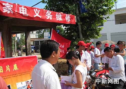 原本就熙熙攘攘的農(nóng)貿(mào)市場,這幾天更是熱鬧非凡,原來是河南農(nóng)大的學(xué)生在這里設(shè)立了科技興農(nóng)服務(wù)臺。“建國60周年成就圖片展”、免費發(fā)放科普手冊及科技光盤、義務(wù)維修家用電器等形式多樣的服務(wù)活動將在這里一一上演。臨行前,王建忠老師一再囑咐我們:本次活動作為我們對建國60周年的獻(xiàn)禮,大家一定要傾盡所學(xué),為三農(nóng)服務(wù)。