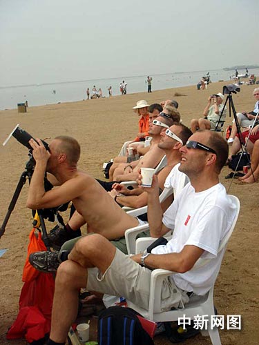 當(dāng)天早晨七點(diǎn)左右,記者來自上海市郊的金山城市沙灘。在這一被稱為本次日全食中國最佳觀測點(diǎn)之一的沙灘上已經(jīng)聚集了一千多名境外天文愛好者。據(jù)悉,此次“跨國追日”活動是由上海、江蘇、云南三地的八家旅行社策劃組織的,成員分別來自美國、加拿大、意大利、西班牙、荷蘭、瑞典、丹麥、日本、泰國等國家。