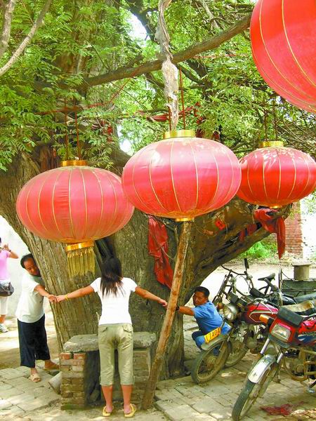“這棵樹可有年頭!”村民楊更偉說,這棵大槐樹已有一千多年的歷史,樹干周長將近5米,5個(gè)成年人才能把這棵大槐樹環(huán)抱住(如圖),偶爾會(huì)有人在樹下燒香,樹洞里布滿了蜘蛛網(wǎng),一直沒人管理。