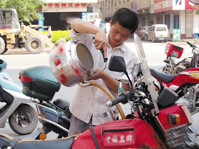 網(wǎng)友“墜入情!痹谔又蟹Q,該加油站位于開縣移民新城南山中路!白钆5木褪怯靡粋(gè)大水壺給摩托車加油”。加油站準(zhǔn)備了幾個(gè)大水壺,壺嘴上都安上一節(jié)水管,每個(gè)水壺連壺蓋都沒有。摩托車司機(jī)需要自己拿水壺到加油機(jī)前打油,加油站工作人員也不管。發(fā)帖者說:“汽油是一種很容易揮發(fā)的物質(zhì),但壺口是敞開的,在加油過程中,大量的汽油極易揮發(fā)出來,加油站彌漫著一股刺鼻的汽油味道,存在著嚴(yán)重的安全隱患。”