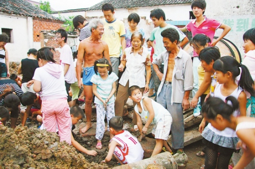 埋著銀元的泥土是來自樟三村中間的一處舊宅基地內(nèi),所以當(dāng)記者趕到那里時,發(fā)現(xiàn)約100平方米的宅基地早被200多個村民堵得嚴(yán)嚴(yán)實實,個個滿身泥污,掘地尋寶。