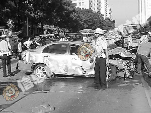 事發(fā)路段在東風(fēng)路農(nóng)林立交處,被橫掃的道路中心鐵護(hù)欄長(zhǎng)達(dá)30多米,附近路面到處是鐵欄桿。一根鐵桿甚至插進(jìn)肇事銀白色小轎車(chē)的車(chē)頭部位,另一根插進(jìn)車(chē)下軸承部位。駕駛室內(nèi)安全氣囊爆破血跡斑斑。