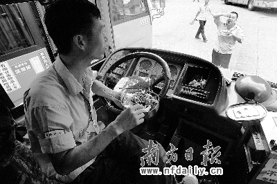 將近下午1點(diǎn),十幾位身著黑褲、淺藍(lán)襯衣的司機(jī)才端著餐盒,一陣?yán)峭袒⒀?他們都是站著,吃飯的速度驚人的快。房間里,6個(gè)不銹鋼的圓桶分別裝著米飯、菜肴、湯水,靠墻的架子上擺著一排排的飯盒、水壺———這座不起眼的狹長(zhǎng)的平房,既是司機(jī)發(fā)車簽到的地方,也是他們的臨時(shí)食堂。