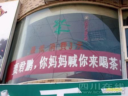再三追問下,來自重慶農(nóng)村的陳先生如實(shí)說,他平時(shí)喜歡上網(wǎng),看到“賈君鵬,你媽媽喊你回家吃飯”這句新的網(wǎng)絡(luò)流行語后,一下子勾起了自己童年的回憶,想起那個(gè)時(shí)候,每天傍晚,媽媽都要喊他回去吃飯的情景。而前兩天,他在網(wǎng)上看到一張照片,重慶的一家火鍋店竟然掛出一條橫幅,上面寫著:“賈君鵬,你媽媽喊你來吃火鍋!”他頓時(shí)靈機(jī)一動(dòng):“我為什么不能依葫蘆畫瓢,也掛一個(gè)橫幅呢?”“那為什么要寫成‘喝茶’呢?”陳先生說:“我這是茶樓,不管飯也不管吃火鍋,打麻將倒是可以,但總不能寫成‘賈君鵬,你媽媽喊你來打麻將’噻,所以就寫成來喝茶了。”至于這橫幅有沒有給茶樓打廣告的意思,陳先生坦言:“也許有一點(diǎn),但一來估計(jì)廣告的效果并不大,二來從自己的本意來說,娛樂的成分還要大過廣告的成分!