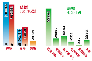 新人笑,離人哭,每個(gè)婚姻登記處每一天都在上演不同的悲歡離合。2009年已經(jīng)過(guò)了一半,半年來(lái),有163795對(duì)新人走進(jìn)婚姻殿堂,又有43281對(duì)夫妻分道揚(yáng)鑣。昨日,本報(bào)邀婚姻專家剖析這半年的婚姻現(xiàn)象,并為不同年齡不同婚齡讀者支招。
