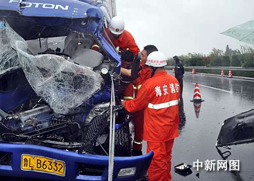 上午8時(shí)11分,海安消防部門(mén)接到縣110指令,稱(chēng)沿海高速海安往如皋方向兩車(chē)發(fā)生追尾事故,一人被困車(chē)內(nèi),情況十分緊急。中隊(duì)迅速出動(dòng)警力起到現(xiàn)場(chǎng)。只見(jiàn)現(xiàn)場(chǎng)滿地都是貨車(chē)上散落的貨物,一輛山東牌照的貨車(chē)卡在蒙古牌照大貨車(chē)的尾部,駕駛座面目全非。山東牌照的貨車(chē)駕駛員更是卡在駕駛室內(nèi),傷勢(shì)較嚴(yán)重,不得動(dòng)彈,情況危急。
