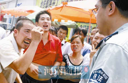 這時(shí)又沖來一中年男子,與執(zhí)法隊(duì)員撕扯起來,場(chǎng)面一片混亂。一攤販告訴記者,這人是朱林的丈夫,姓許,信陽固始人,兄妹八人都在附近做生意。這一帶賣水果的都是信陽老鄉(xiāng),來鄭做生意已有十多年。