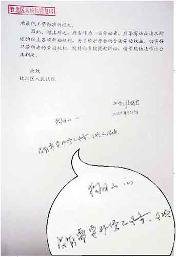 去年12月8日,李先生到法院查閱案件材料時(shí),在一份起訴狀的末頁(yè),看到有人在空白處寫下了兩行文字。上一行寫著“狗日的”字樣,下一行則寫著“沒有需要補(bǔ)償?shù)牧x務(wù)、事項(xiàng)和理由”字樣(見左圖)。夫妻倆認(rèn)為,有人誤導(dǎo)和左右了此次判案。