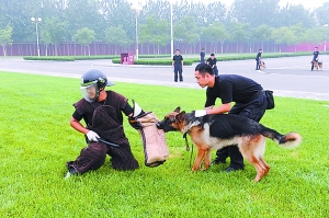 昨天,十余名首都機場分局馴犬員帶領著6只德國牧羊犬在首都機場專機樓廣場進行了集訓。這6只警犬是今年6月,機場公安分局張志副局長帶隊三上沈陽到公安部沈陽警犬基地精心挑選的。入選條件非常嚴格,從警犬的神經(jīng)類型敏感度到興奮度,從犬只的聽力到四肢的力量,都需要符合嚴格標準。(記者王薔)