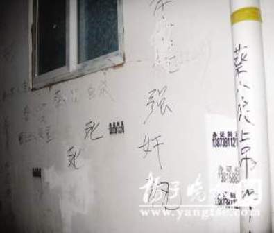 “看見兩個女子趁黑在墻上寫東西,現(xiàn)在看來就是寫這些東西了!币晃荒繐粽吒嬖V記者,前天晚上,趁著天黑,有兩名女子來到明園這戶居民家門前,開始寫東西,左寫右寫,寫了約摸有十幾分鐘就走了,昨天早上8點多,戶主起床開門后,這才發(fā)現(xiàn)自家墻上及附近低矮的圍擋板上,均有指名道姓的罵人語句。記者看到,從戶主蔡先生家門兩邊向外,以及對門的圍擋板上,留有大黑簽字筆寫下的罵人語句,諸如“蔡某某人渣”、“蔡某某缺德”、“蔡某某強奸犯”等等,還有一些更加不堪入耳辱罵的話,讓人看了瞠目結(jié)舌。粗略數(shù)數(shù),多達十幾處。