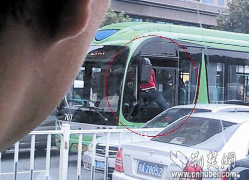 一名網友拍到了整個過程,并發(fā)到了網上,圖片顯示:一名穿紅色上衣的男子腳踩在一輛銀色轎車上,上半身鉆進公汽的駕駛室里,毆打公汽司機。該網友稱,被打的是707路公汽司機,公汽司機一直沒還手。