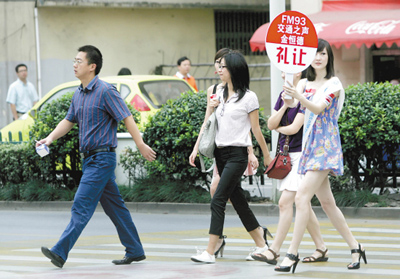 盡管這時的交通還有些繁忙,但過往的司機(jī)們看到這么熱情的美女,大多很自覺地在斑馬線前剎住了車,行人們則從容地過起了馬路。