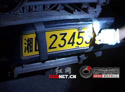 隨后,民警又?jǐn)r下一輛大貨車。這輛車不僅車尾沒有懸掛號牌,前面也做了手腳。司機用兩副皮筋遮住了前牌照,遮住了末尾一個數(shù)字,還在歸屬地來了個“貍貓換太子”,湘D變成了湘L!