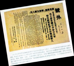 “這本書(shū)里我精選了其中的312張?zhí)柾猓渲杏薪夥艖?zhàn)爭(zhēng)時(shí)期人民解放軍解放30個(gè)省會(huì)城市和許多大、中城市時(shí)發(fā)行的報(bào)紙?zhí)柾猓约啊髴?zhàn)役’、渡江戰(zhàn)役等號(hào)外。特別是10多張開(kāi)國(guó)大典號(hào)外,見(jiàn)證了毛主席在天安門(mén)城樓上宣告‘中華人民共和國(guó)中央人民政府已于今日成立了’的偉大歷史性時(shí)刻!睆埻ψ院赖卣f(shuō),書(shū)中收藏的大部分號(hào)外是首次面世,其中最珍貴的有兩張:一張是1949年4月21日《人民日?qǐng)?bào)》出版的號(hào)外“南京國(guó)民黨政府拒絕國(guó)內(nèi)和平協(xié)定毛主席朱總司令命令全軍堅(jiān)決徹底干凈全部殲滅敵人”;另一張是1949年4月24日,解放軍攻入太原,當(dāng)日《人民日?qǐng)?bào)》出版“南京反動(dòng)政府宣告滅亡狼狽奔逃我正向南京急進(jìn)各界已成立治安維持委員會(huì)致電毛主席歡迎解放軍入城”的號(hào)外。