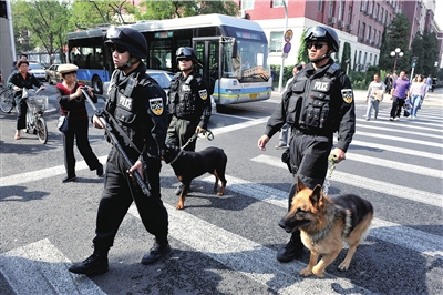 昨天上午,3名頭戴防暴頭盔,身配18.4毫米防暴槍、95式?jīng)_鋒槍和92式手槍,帶領(lǐng)兩只警犬巡邏的特警隊(duì)員現(xiàn)身臺(tái)基廠北口。昨天起,武裝特警開始帶警犬在長(zhǎng)安街沿線、西單、王府井等重點(diǎn)地區(qū)巡邏。據(jù)悉,多個(gè)特警巡邏車組從早8點(diǎn)半到晚10點(diǎn)無(wú)縫隙地進(jìn)行巡邏,每個(gè)車組由3名特警隊(duì)員組成,參加巡邏的還包括部分女特警隊(duì)員。警方提醒市民,由于特警攜帶的大多是撲咬犬,看到警犬后千萬(wàn)不要試圖撫摸、引逗警犬。(董世彪 盧國(guó)強(qiáng))